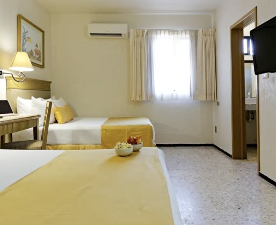 Our double rooms are equipped with two double beds, desk, safe, 32” television, ironing kit (on request), bedside lamp and mirror in the room and bathroom.